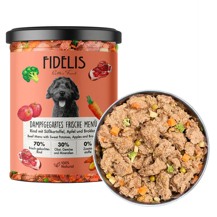 Das „Steak Menü“ für deinen Liebling! 70% saftiges, schonend gekochtes Rind mit knackigen Süßkartoffeln, frischem Gemüse und leckerem Obst als passende Beilage. Komplettiert wird das Menü durch natürliche Mineralien, hochwertigem Lachs Öl und würzigem Rosmarin.