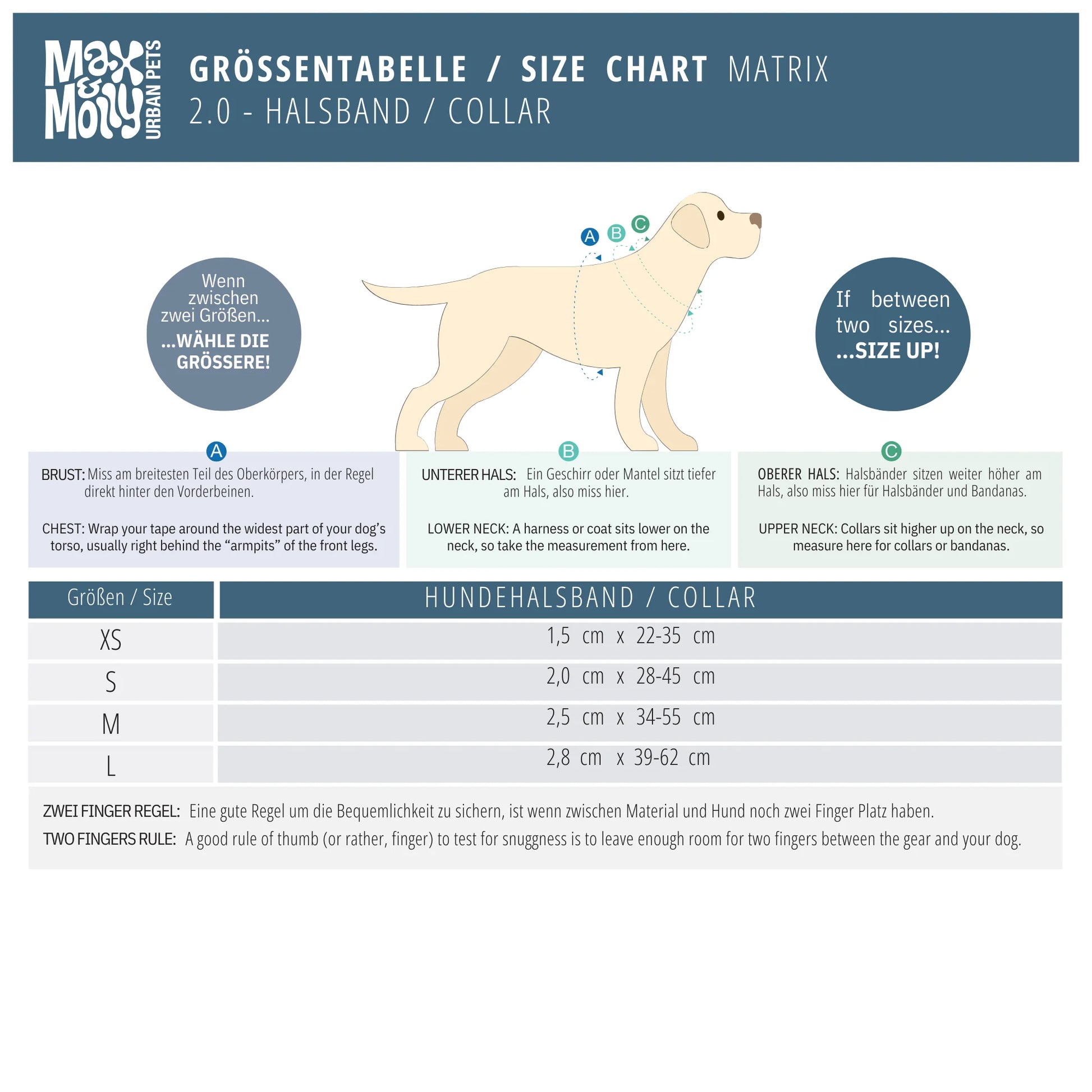 Alle Halsbänder bestehen aus einer robusten, dezent geprägten Polyesterseite und einer weichen, anschmiegsamen Neoprenseite. Durch die Materialauswahl sind die Halsbäder ultraleicht und für deinen Hund besonders angenehm zu tragen. Außerdem haben sie noch einen Sicherheitsring, der das Ausbüxen während des An- und Ablegens des Halsbandes verhindert. Die Größe ist dank des Schiebers stufenlos einstellbar.