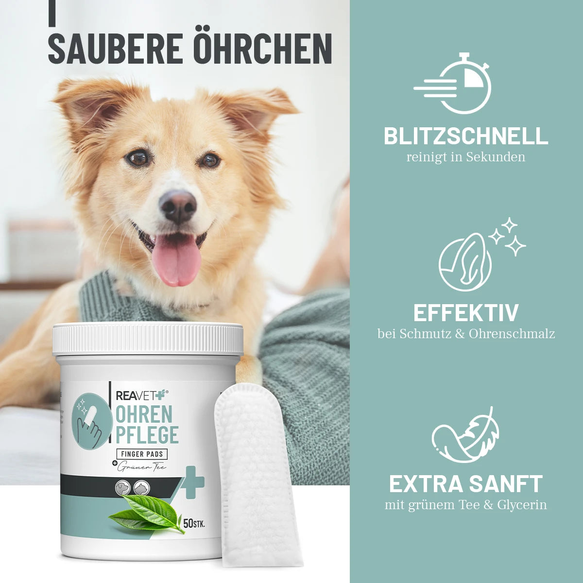 Die REAVET Ohrenpflege Fingerpads machen die Ohrenreinigung bei Hunden und Katzen so einfach wie nie zuvor. Die vorgetränkten Pads sind sofort einsatzbereit und ermöglichen eine gezielte, schonende Reinigung der Ohrmuschel und des äußeren Gehörgangs – ganz ohne Tropfen oder Wattepads.