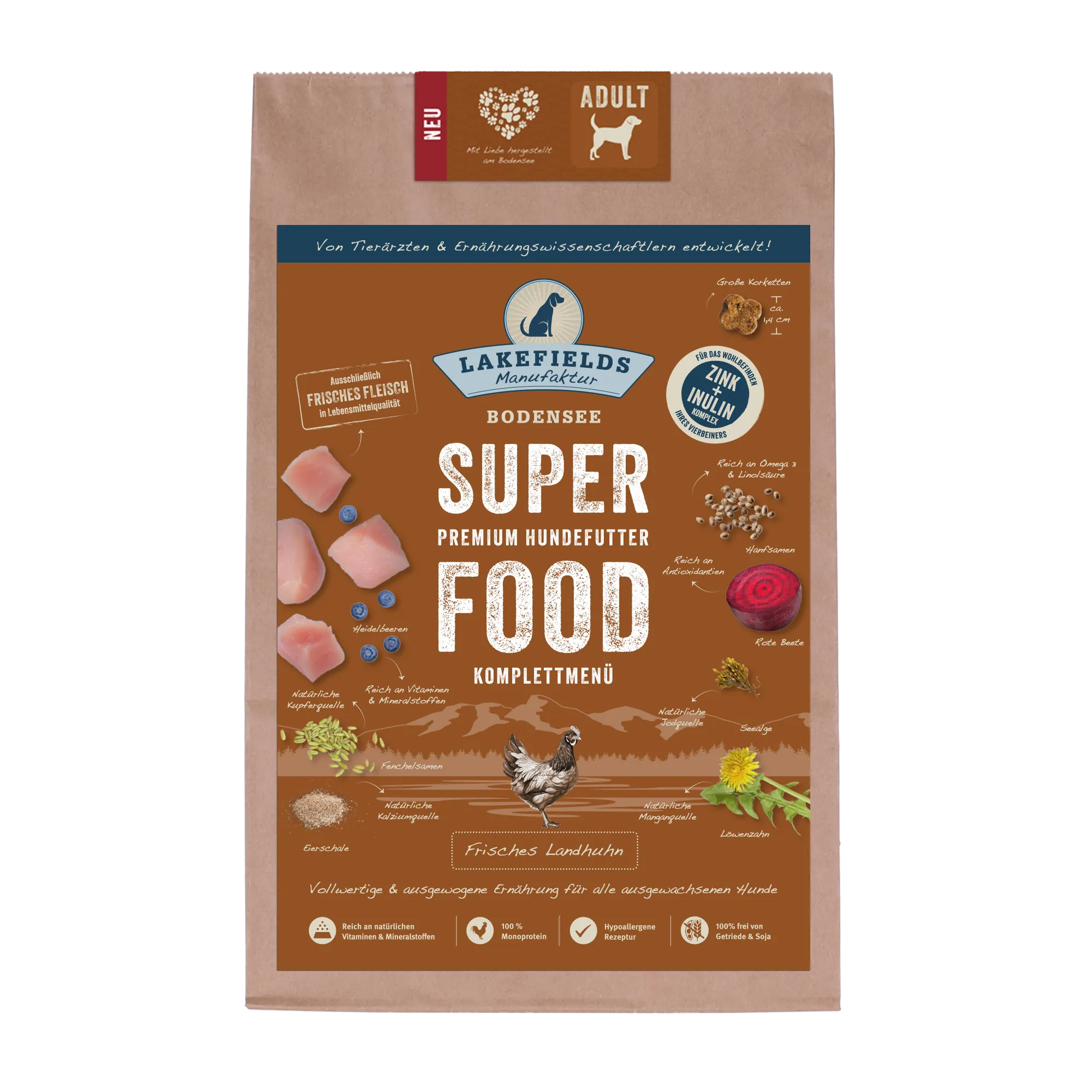 Entdecke das brandneues Premium SUPERFOOD für ausgewachsene Hunde aller Rassen. SUPERFOOD wurde über mehrere Jahre von Ernährungswissenschaftlern und Tierärzten entwickelt und zeichnet sich durch seine einzigartigen Zutaten und die besonders hohe Nährstoffdichte aus. Dadurch deckt es sowohl den Energiebedarf besonders aktiver Hunde als auch weniger aktiver Hunde. Die einzigartige Rezeptur setzt sich aus nährstoffreichen Superfoods, saftigem Obst und Gemüse, frischem Fleisch und einer wertvollen Ergänzung von Zink und Inulin zusammen. Dadurch deckt die Rezeptur die ernährungsphysiologischen Bedürfnisse aller Vierbeiner ab und versorgt sie mit allem, was sie für ein starkes Immunsystem und einen gesunden Stoffwechsel brauchen.